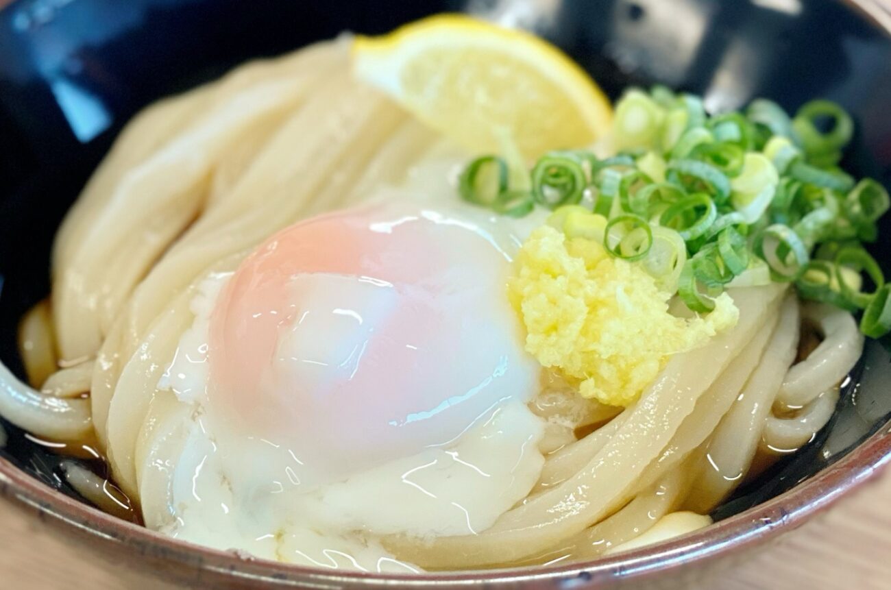 とぅるんとぅるんの温玉がぶっかけうどんの上に載っています。