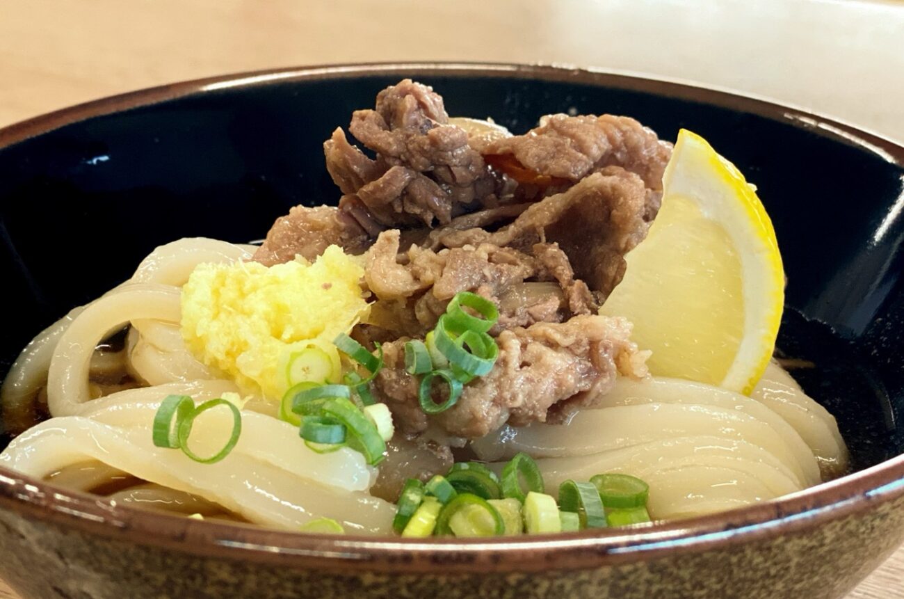 甘辛い肉、そしてレモン、ショウガ、ネギが載っているぶかっけうどんです。