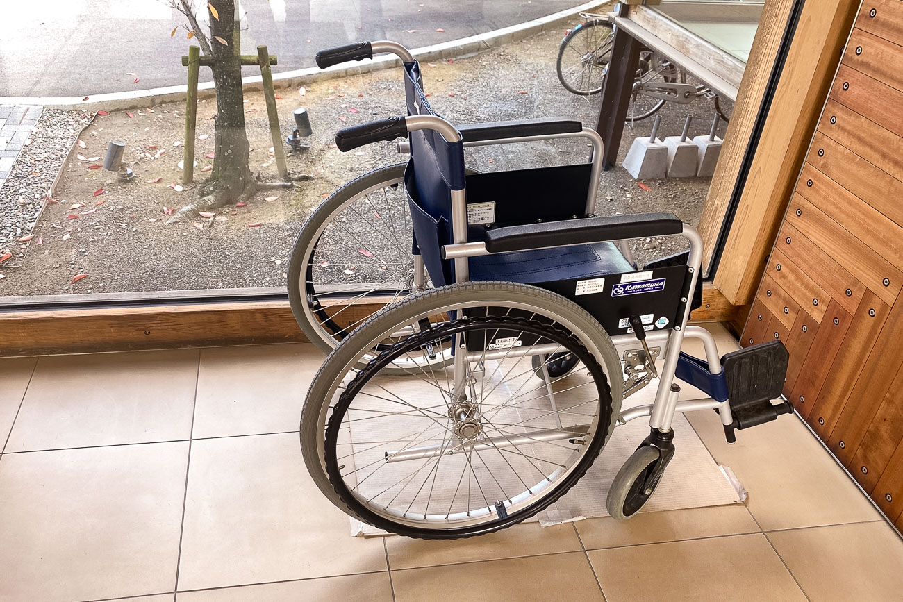 スロープを登り、自動ドアが開き、まず目に入るのが、車椅子。