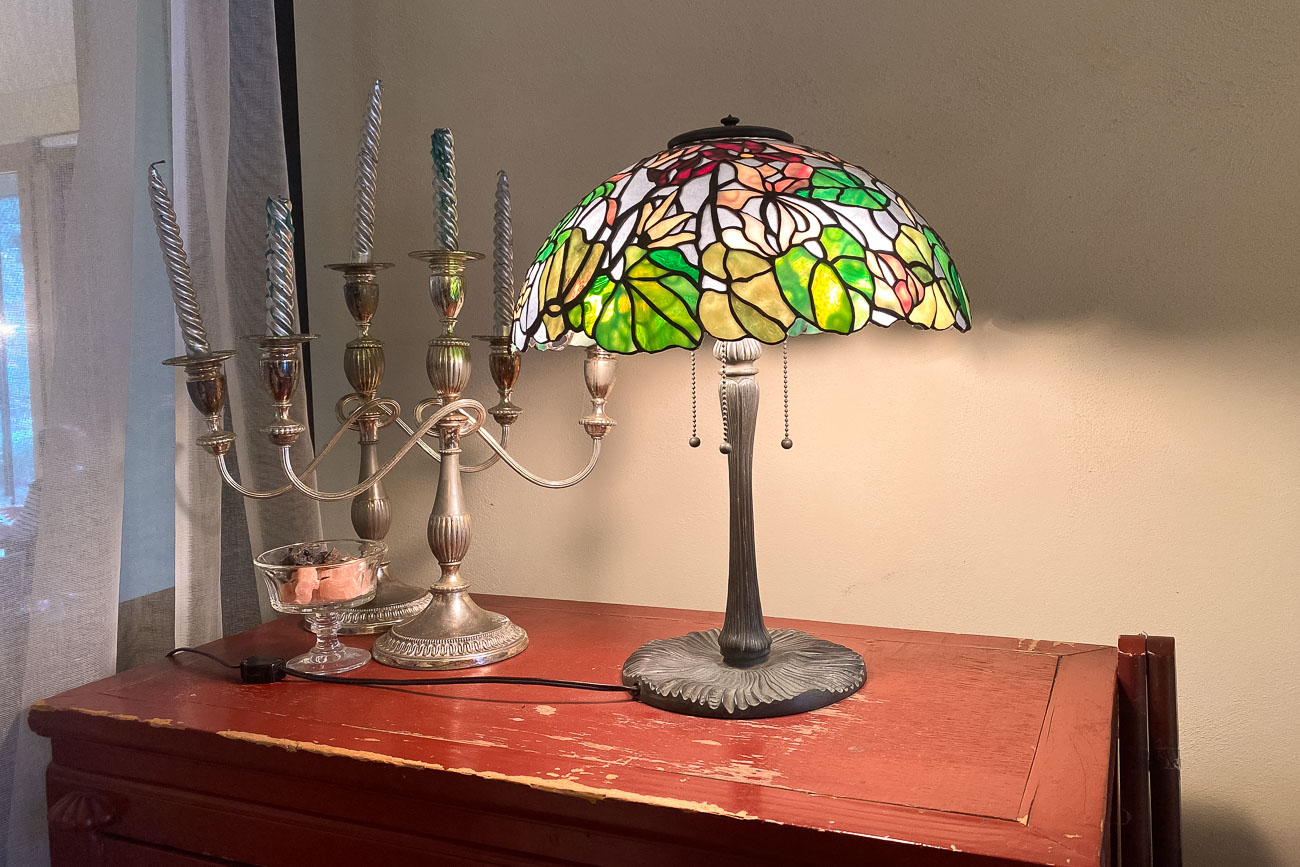 右前には飾られたドレスと、美しいステンドグラスのライト。