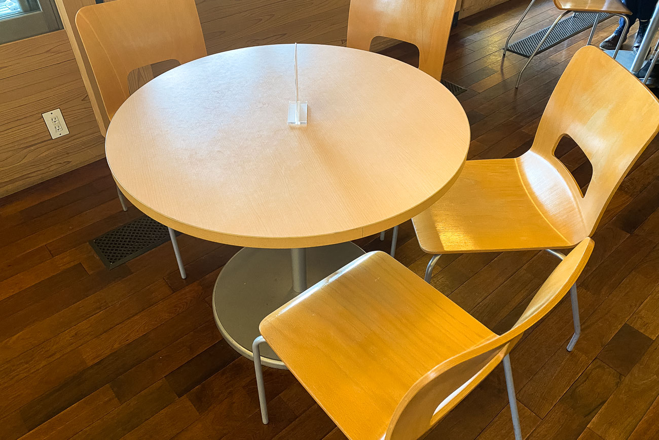 偕行社かふぇのテーブルは、木の温もりを感じる落ち着いたデザイン。