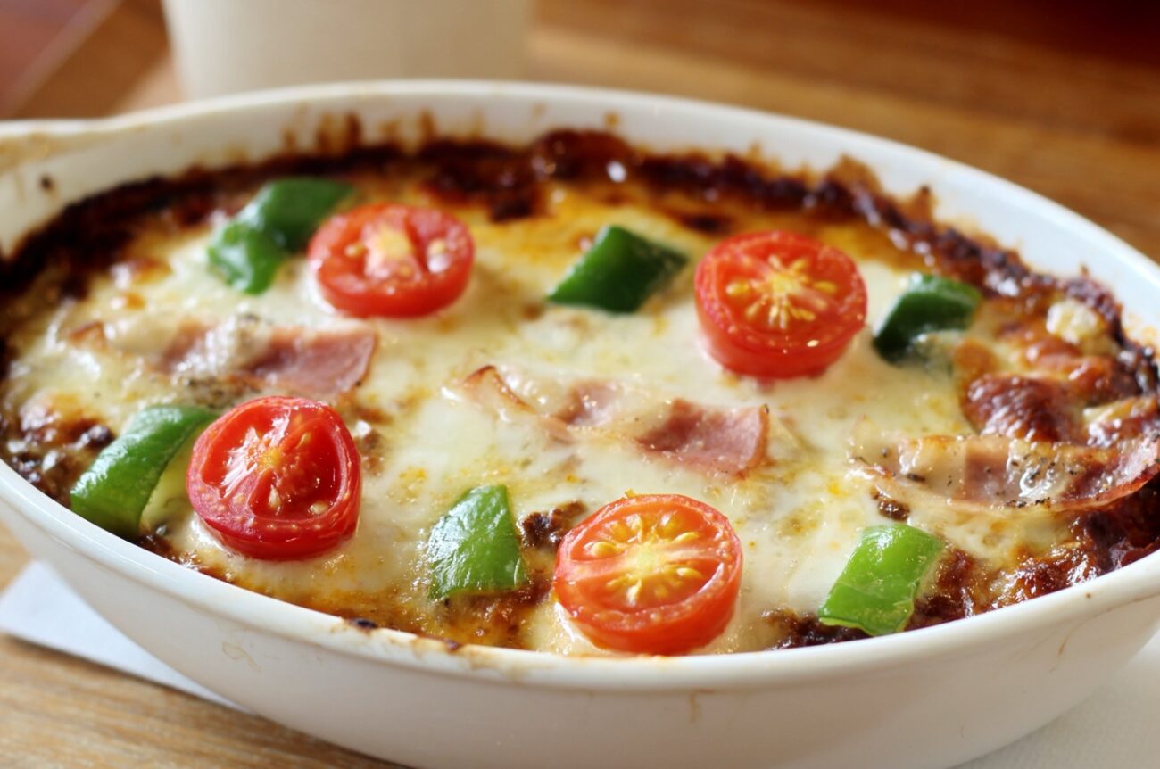 バジルライスとミートソースの古代米ドリアです。
