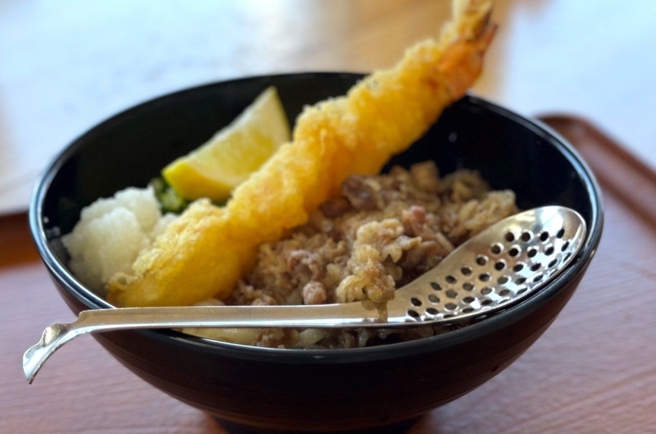 肉うどんの上にエビ天が載った肉エビぶっかけです。
