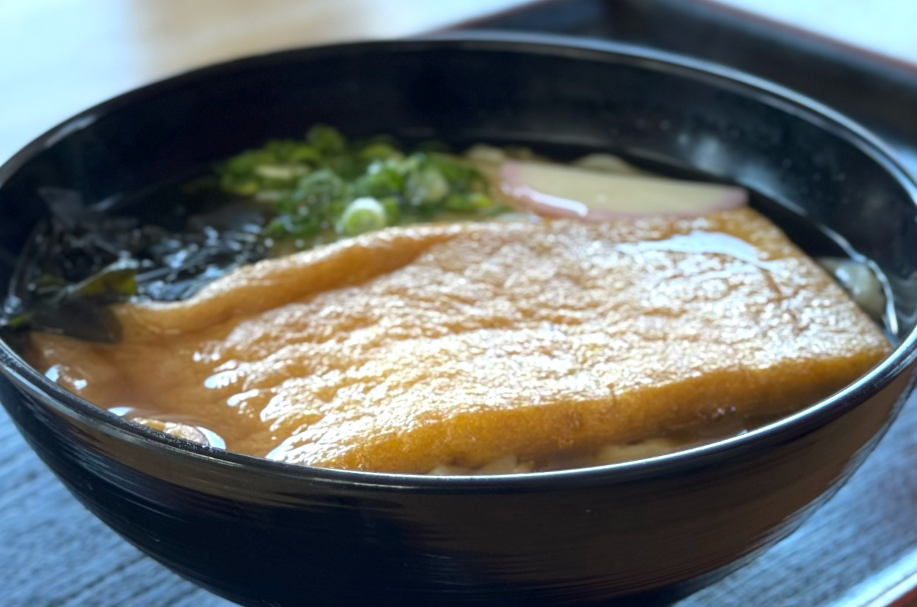 長方形で大きなおあげが載っていて、麺が見えないレベルです。